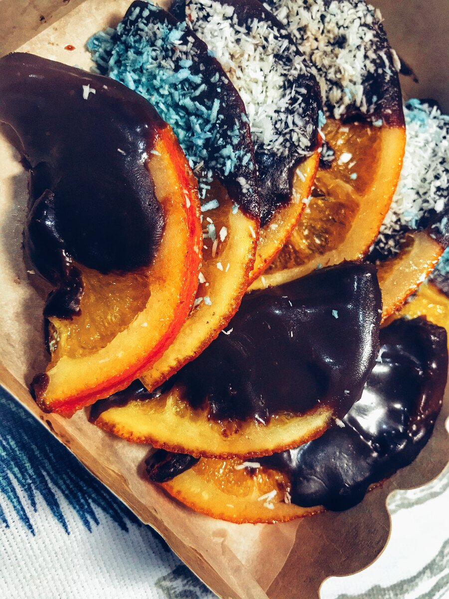 Обязательно приготовьте перед праздниками апельсины в шоколаде. Простой, но очень вкусный десерт, который наполнит дом чудесным ароматом. Ингредиенты: 👇 Способ приготовления: 👇 ✔️ Апельсины помойте и нарежьте полукольцами толщиной 5 мм. ✔️ В кастрюле вскипятите воду. Выключите газ. ✔️ Отпустите полукольца апельсина на 5 минут кипяток. ✔️ Из сахара и воды сварите сироп на медленном огне до растворения сахара. ✔️ Вымоченные апельсины выложите на вафельное полотенце и обсушите. ✔️ Помести апельсины на сковороду и залейте сиропом. ✔️ Поставьте на маленький огонь и варите апельсины полтора часа. ✔️ Апельсины выложите на противень, застеленный пекарской бумагой. ✔️ Поставьте противень с апельсинами в духовку на 30 минут при 100 градусах. ✔️ Растопите горький или темный шоколад на водяной бане. ✔️ Остывшие апельсины обмакните в шоколаде до середины и украсьте кокосовой стружкой. Приятного аппетита! ❗ ❗ ❗ Совет: сироп от апельсинов не выливаем. Его можно добавлять в чай, мартини