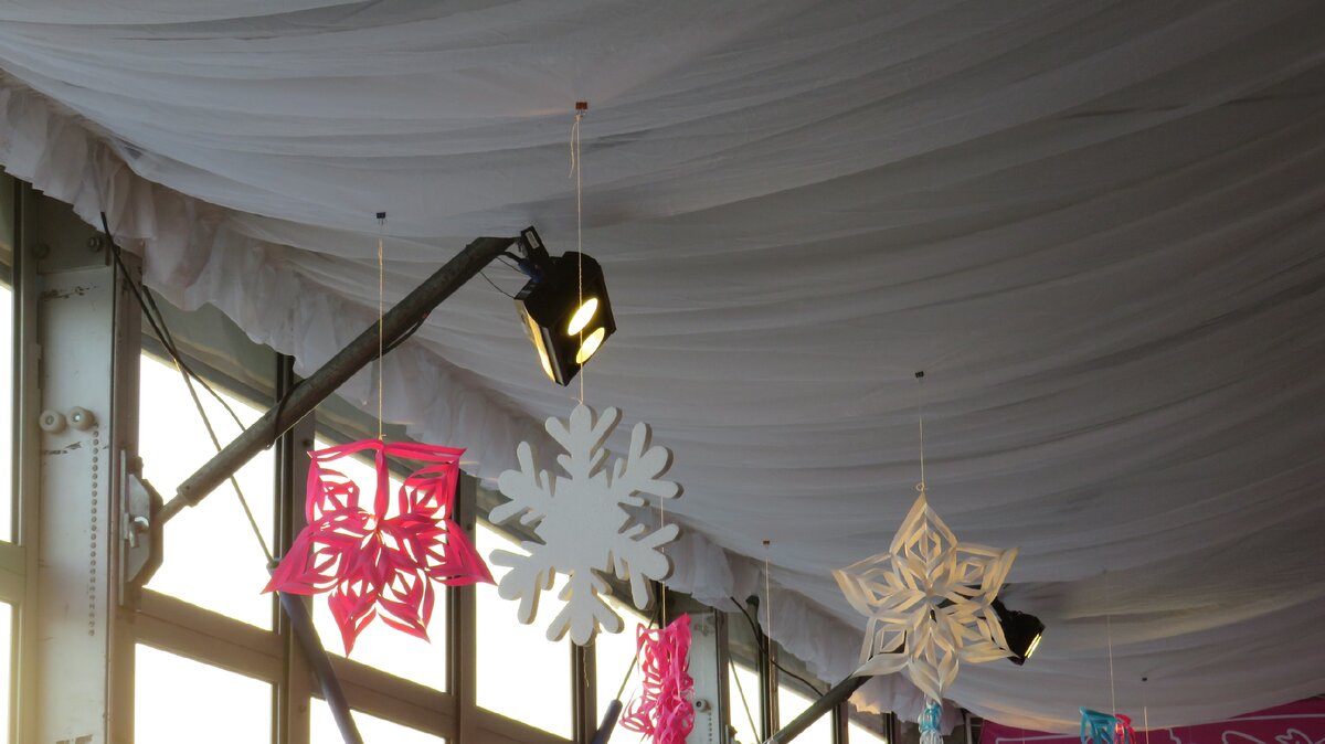 В прошлом году в школу ребенку понадобилось делать снежинки. Мы сделали несколько маленьких – для украшения окон. Но захотелось попробовать сделать и другую – большую. Некоторое время она висела в классе у дочки, а с наступлением каникул мы забрали ее домой. А идея пришла в голову, когда увидели такие снежинки в детском центре. Чтобы сделать большую снежинку, мы взяли одну потолочную плитку, оставшуюся после оклеивания потолка. Чтобы изделие получилась равномерным, сделали выкройку из газетки - так, как обычно вырезают снежинки. Потом эту газетную выкройку вырезали по контуру, приложили к плитке и обвели фломастером. Вот такая она в расправленном виде. Самое сложное оказалось - вырезать потолочную плитку точно по нарисованному контуру. Я почему-то думала, что это будет просто. Но плитка ножом пилилась очень медленно, чуть направишь лезвие не под тем углом - ломалась. Попеременно работая то ножом, то острым ножницами и длинными лезвиями, удалось обпилить снежинку по наружному конт