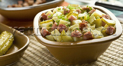 Салат картофельный является вкусным и сытным блюдом. Основным ингредиентом такого салата является, конечно же, картофель. Кстати, картофель часто называют «вторым хлебом». И это действительно так. Картофель в салате отлично сочетается с любыми ингредиентами. И по какому бы рецепту салат не был приготовлен, он всегда получается сытным и очень вкусным. Я хочу вам предложить рецепт картофельного салата по-немецки. Для приготовления салата нам будут нужны вот эти ингредиенты: