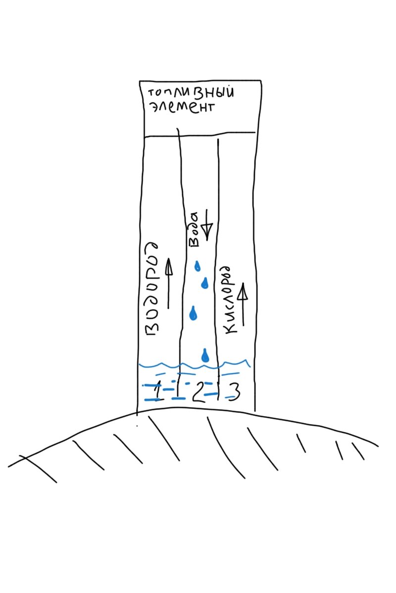 Ещё школьником я придумал схему вечного двигателя, который сам, по сию пору, не смог опровергнуть. А опровергнуть надо, потому, что я человек не безграмотный и законы сохранения знаю. Я показывал эту схему множеству людей с техническим образованием, но все их опровержения сводились к словам "-всё равно никакой он не вечный, потому что ничего вечного нет!". Но я не такого ответа жду, мне нужно доказательство того, что эта модель не нарушает законов сохранения энергии и потому вечным двигателем считаться не может. Вот принципиальная схема агрегата: На рисунке мы видим башню, стоящую на земле. В основании башни резервуар с водой, в нём идёт электролиз для получения водорода и кислорода. Средняя часть башни разделена на три канала, по крайним каналам идут газы - продукты электролиза, по среднему вниз льется вода.В верху башни топливный элемент, в нём водород и кислород реагируют и получается электричество. Итак, заводим наш вечный двигатель. В самом начале, конечно, нужн