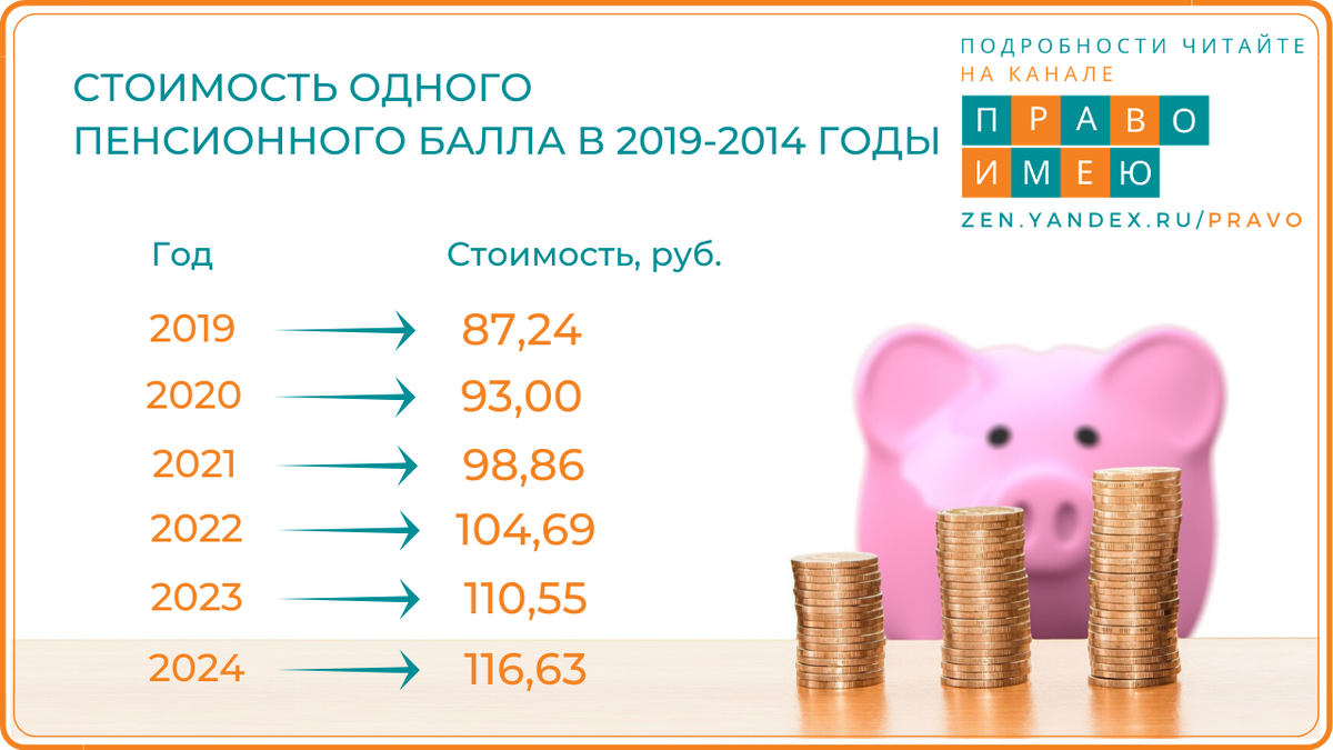 С 2015 года расчёт страховой пенсии стал прозрачным. Справедливым или нет – другой вопрос. Но то, что теперь вы можете узнать предварительный размер своей пенсии – это факт. Давайте вместе с каналом ПРАВО ИМЕЮ присмотримся к нему внимательно. Пенсионные баллы + фиксированная выплата = страховая пенсия Страховая пенсия состоит из двух частей. Первая часть – пенсионные баллы или, как их официально называют, индивидуальные пенсионные коэффициенты (ИПК). Стоимость пенсионных баллов закреплена Владимиром Путиным на 2019-2024 годы. Смотрите в иллюстрации, сколько стоит один балл по каждому году в отдельности. Вторая часть – фиксированная выплата к страховой пенсии. Выплата ежемесячная и её размер для большинства российских пенсионеров одинаков (исключение – северяне и ряд льготников, которым выплата начисляется в повышенном объёме). Размер фиксированной выплаты к страховой пенсии также закреплён президентом до 2024 года. Как рассчитывается пенсия? С 2015 года страховая пенсия по старости рас