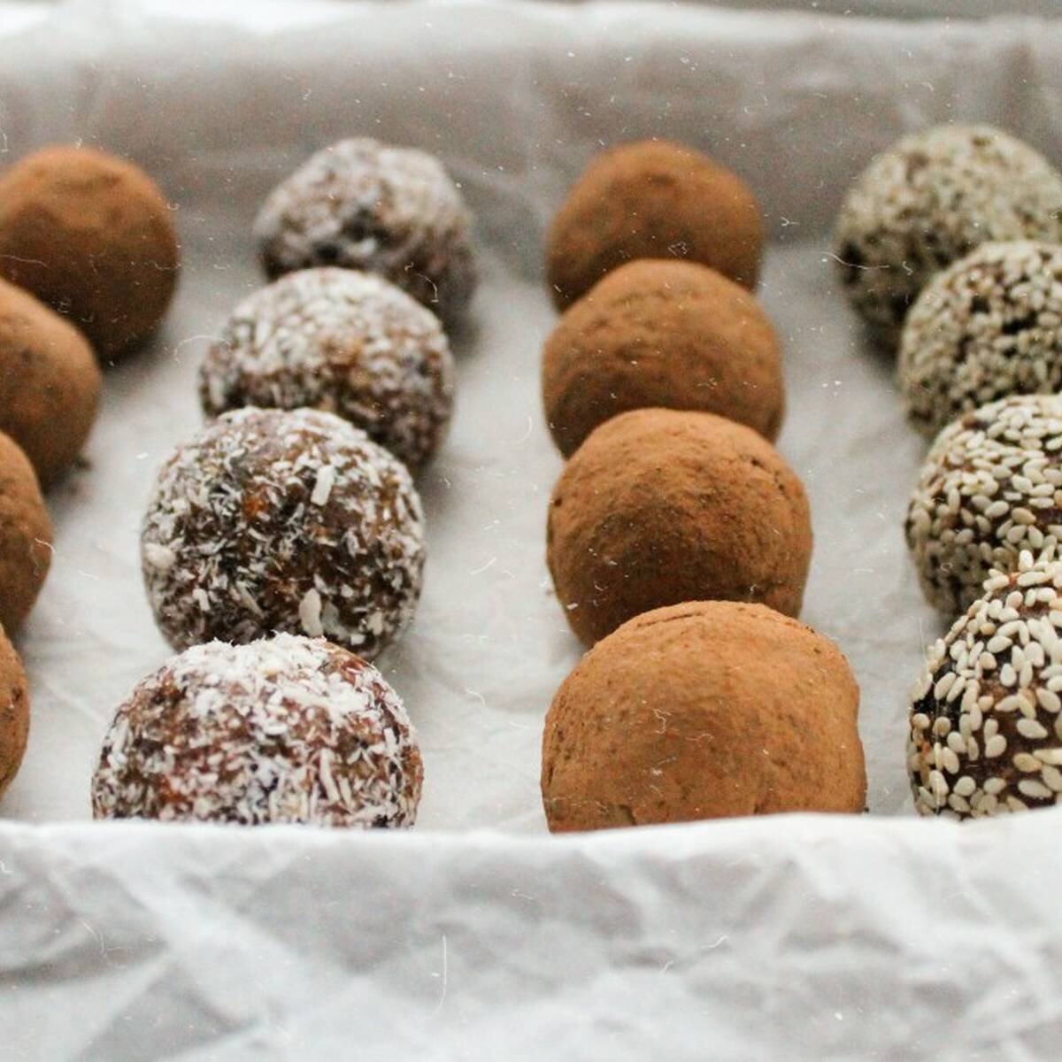 Всегда хочется чего-нибудь сладкого, а если это праздник, то хочется ещё больше. Рецепт конфет из фиников и орехов невероятно прост в приготовлении, а получающийся в итоге десерт никого не оставит равнодушным. Для приготовления вам понадобятся: - 0, 5 стакана мягких фиников; - 1, 5-2 стакана орехов и семечек (в разных пропорциях разные орехи: арахис, грецкие орехи, мендаль, кешью и тд); - Можно добавить мёд 1 ст. л., лучше всего зернистый, а не жидкий; - Для обсыпки: по 1-3 ч. л. каждого вида: кокосовая стружка, семена кунжута, какао-порошок, молотые орехи; Пошаговое приготовление конфет: 1. Вначале нужно приготовить все ингредиенты – вымыть и очистить, вынуть из фиников косточки (если финики твёрдые, то заранее размочить в воде). 2. Орехи можно подсушить на сковороде, чтобы вкус был насыщенным. 3. В блендере измельчить орехи, откладываем небольшое количество для обсыпки. 4. Смешиваем орехи с остальными ингредиентами и мёдом, если вы решили его добавлять. 5. Из получившийся смеси