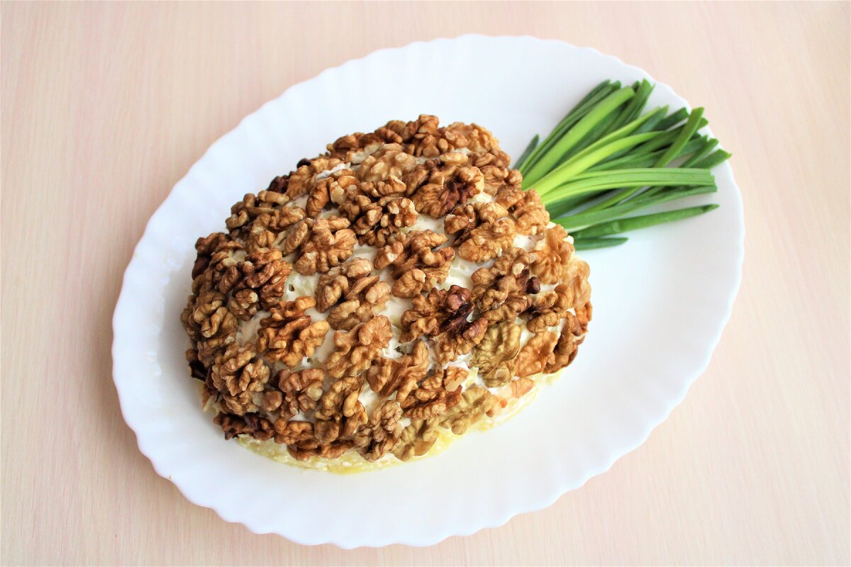Можно, как я, украсить салат половинками грецкого ореха, это будет смотреться красиво и будет похоже на фрукт, но не очень удобно есть, кусочки ореха слишком крупные. Второй вариант - измельчить орехи ножом или с помощью блендера и украсить салат, так есть гораздо удобнее, но выглядит не так эффектно.