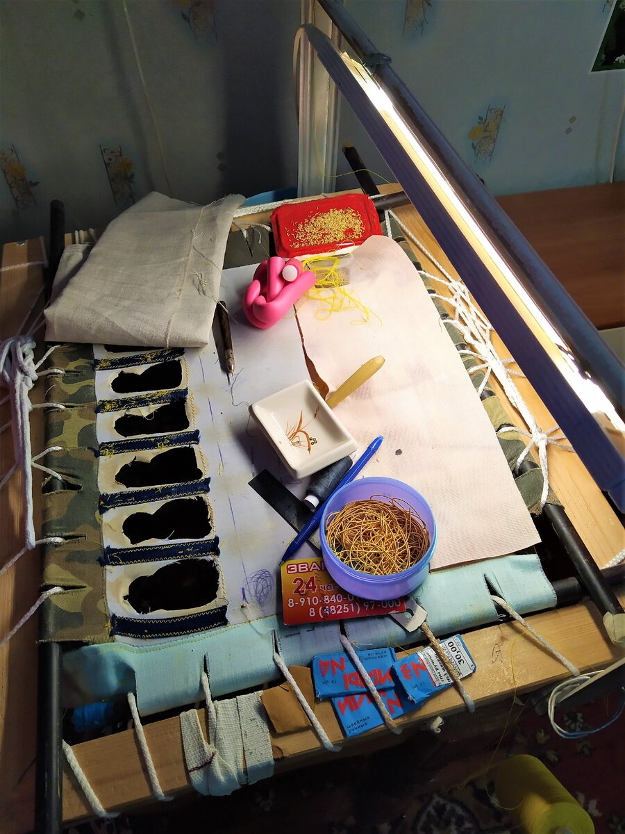 Этот станок для рукоделий, а точнее, для вышивания золотом на бархате, Марина сделала себе сама, " под себя", под свою руку. Над небольшим столиком - светильник. Полотно вместо столешницы, словно большие пяльца.