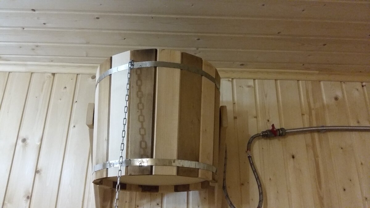 Обливаться ледяной водой, выходя из парики, это точно не для каждого. В своей работе (я устанавливаю банные и отопительные печи), очень редко вижу, обливные ведра, где-то место не позволяет, так как очень маленькое моечное помещение, где-то высота потолков не дает нормально его разместит. В этой бане созданы идеальные условия, для того чтобы повешать обливное ведро. Большая мойка, по своим размерам, высота более 2.3 метра. Ведро изготовлено из нескольких материалов, это липа и пластиковый вставыш. С наружи куски из липы, стянуты металлической полосой. Снизу, есть вставка из фанеры. Внутри стоит поплавковая система, которая позволяет регулировать наполняемость ведра, нужно только открыть кран. Система унитаза) Потянув за цепочку, вода превращает обычного человека в "моржа". У хозяина этой бани, вода поступает прямо из скважины и она просто ледяная, даже если выйти нагретым или пропаренным из парилки, все равно, очень холодно. По мне так лучше выбежать на улицу и плюхнутся в снег, и то т