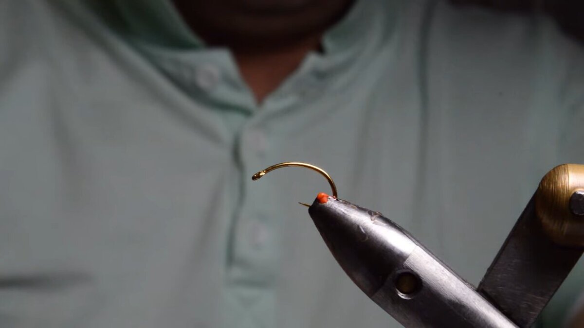 Фиксируем трубочку к цевью. Теперь обмотаем свинцовой проволокой. Далее красным маркером красим проволоку. Перетягиваем трубочку в сторону ушка крючка и фиксируем нитью.