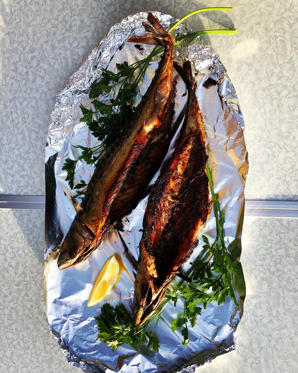 Когда надоели шашлыки из мяса и курицы, можно разнообразить пикник скумбрией, запеченной на углях! Рыба получается нежнейшей и сочной! Для приготовления нам понадобится: ✔️скумбрия - 2 шт. ✔️концентрированный лимонный сок или сок лимона ✔️соль ✔️итальянские травы ✔️сушеный измельчённый чеснок ✔️земли-сунели ✔️устричный соус Очищаем рыбу от внутренностей, удаляем жабры, промываем под водой. Немного солим (учитываем, что устричный соус соленый). Во внутрь рыбы добавляем немного хмели-сунели, итальянские травы, измельчённый сушеный чеснок, устричный соус (по 1 ст.л. ложке на каждую рыбу), сбрызгиваем лимонным соком. Все ингредиенты равномерно распределяем по внутренней части рыбы. Снаружи рыбу слегка обмазываем устричным соусом. Складываем в контейнер и отправляем мариноваться в холодильник на сутки. Затем жарим до готовности на углях. Жарить рыбу лучше всего на шампурах и располагать таким образом, как на фото Готовую рыбу выкладываем на фольгу. Приятного аппетита!