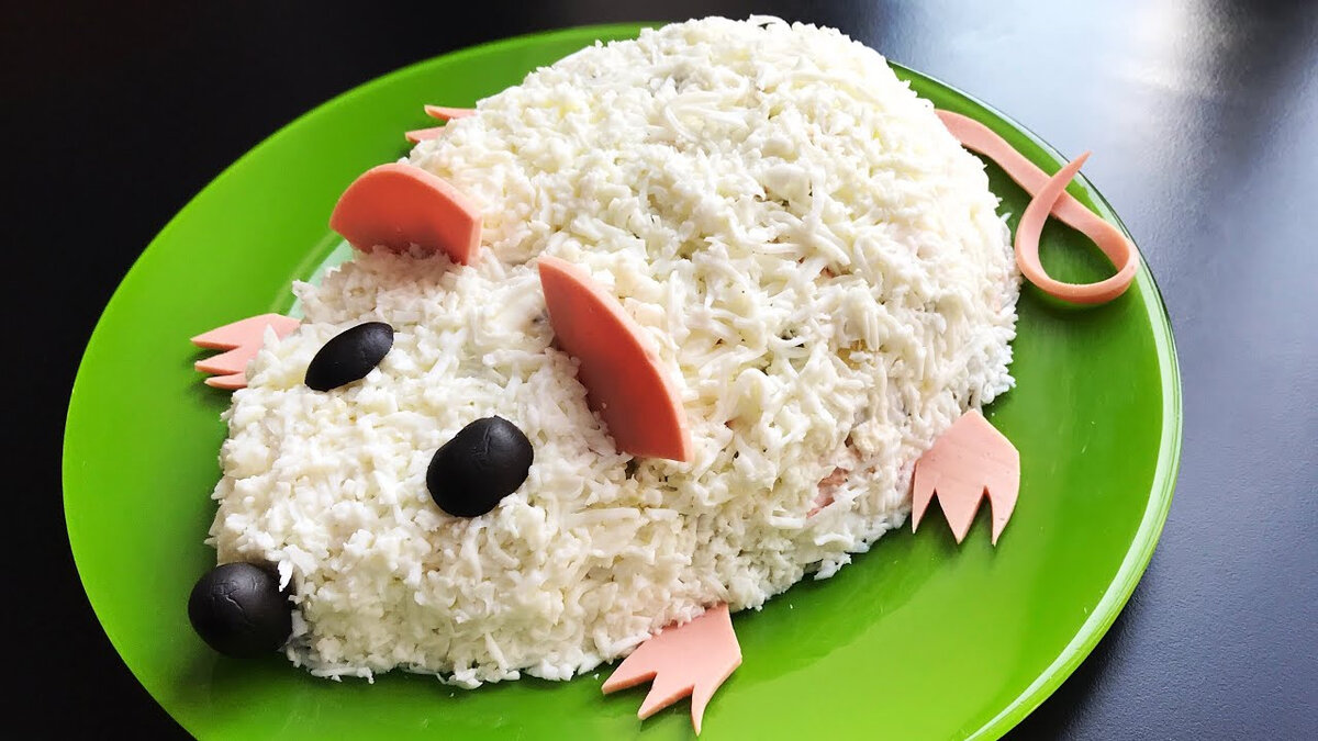 Следующий год по Китайскому календарю — год Белой крысы. Поэтому мы решили, что будет очень символично подать салат на новогодний стол в виде милой мышки. Кроме того, что он украсит стол, салат станет отличным средством от опьянения. Так как очень сытный и вкусный. Пищевая ценность: Калорийность — 151,93 ккал; Белки — 10,28 г; Жиры — 10,78 г; Углеводы — 2,98 г. Что: — куриная грудка 0,5 шт.; — яйца куриные 5 шт.; — морковь 1 шт.; — консервированные шампиньоны 250 г; — твердый сыр 125 г; — лук репчатый 1 шт.; — сахар 15 г; — уксус 9% 15 мл; — горячая вода 100 мл; — соль по вкусу; — майонез 100 г. Как: 1️⃣Измельчите репчатый лук и замочите его с сахаром, уксусом и горячей водой. Он немного промаринуется и станет не таким горьким. 2️⃣Вкрутую сварите яйца. Также отварите куриную грудку и морковь. Остудите морковь, яйца и курицу. Морковь натрите на мелкой терке. Желток и белок натрите отдельно. Желток в=на мелкой терке, белок на крупной. Курицу разберите на волокна. 3️⃣Натрите твердый сы