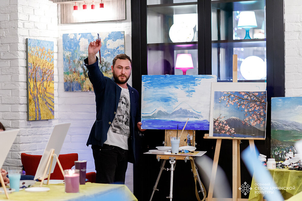 Была суббота, я впервые пришла на наше мероприятие вовремя. Хотелось рисовать, а еще кофеин и спать. У Эмиля, между тем, все было готово для того, чтобы провести последний мастер-класс в программе Сезона. Накануне я ходила на рисовальный завтрак, а теперь у меня рисование без завтрака. Не слишком выгодный обмен, зато тут были холсты и масло, а не маркеры и промасленный из-за круассана скетчбук. Темой встречи был цветущий персик в Араратской долине. «У вас у всех по три кисточки: большая, маленькая и средняя», — рассказывал Эмиль. А у меня было десять маркеров, и все одинаковые. «Обратите внимание, что у вас нет карандаша: намечать рисунок будем сразу кисточкой», — продолжает Эмиль. А у меня был карандаш, не знаю, зачем всем знать об этом. К началу второй части мастер-класса на холстах появились большой и малый Арараты, голубое небо и ветви персикового дерева на первом плане. В моем скетчбуке появились большая и малая панелька, потому что нельзя просто так взять и перестать рисовать Чер