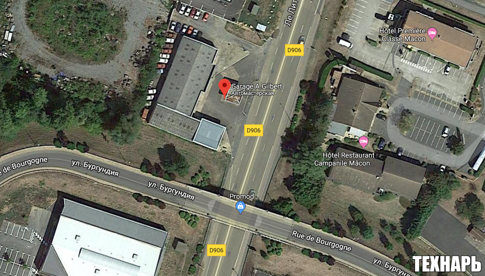 В городе Макон во Франции располагается автомастерская, именуемая "Гараж Гилберта". Чем примечательно это место? Автомастерская являлась когда-то дилером марки Лада, но спустя время владелец забросил это место, оставив автомобили на произвол судьбы. Доподлинно не известно, что заставило владельца оставить свой бизнес, вероятнее всего, долги и приостановление поставок автомобилей Лада во Францию. Если посмотреть на изображение из Гугл, датируемое 2013-м годом, видно, что торговля еще велась, стояли новые Нивы перед входом, но старые потрепанные вывески уже говорят, что дела в салоне шли плохо. В настоящее время подход к салону закрыт лентой и никакая деятельность не ведется. За автосалоном находятся бывшие в употреблении автомобили, многие повреждены и находятся в печальном состоянии. С лицевой стороны салона стоят более живые автомобили: Бывшие в употреблении автомобили практически все на французских номерах, ездили по дорогам Франции, многие из них имеют на лобовом стекле виньетки (