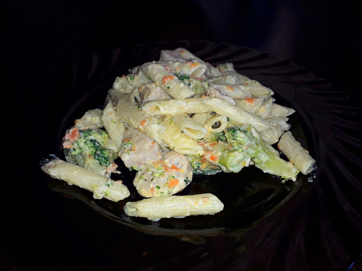 Продукты: 2. На разогретую сковородку вылаживаем обжариваться мяса спустя 8 минут добавляем лук и морковку 3. После того как все обжарится добавляем брокколи,соль перец по вкусу,добавляем воды 50мл и тушим 5 минут. 4. Когда все готова добавляем сливки и ждем когда немного загустеет 5. Затем промытые макароны вылаживаем к соусу и все готова!) Приятного аппетита! Поставь палец верх)