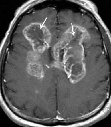 Магнитно-резонансная и компьютерная томография – наиболее информативные методы исследования. МРТ головного мозга позволяет выявить очаг опухоли или перифокального отека как реакцию на опухолевый рост. МРТ безопасный для пациента метод, так как во время сканирования организм не облучается. У магнитной томографии есть недостаток: снимок рака мозга не позволяет отличать доброкачественные опухоли от злокачественных. Рак мозга на МРТ выглядит как очаг ограниченный темный очаг, окруженный воспалительным валом.