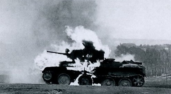 Перед атакой всем с командиром поделился. Командир все воспринял серьезно, потом мы решили следовать именно за тем танком, чтобы в случае чего спасти экипаж... Бежим и глаз с танка не сводим, видим как мчится наш подопечный, резко маневрирует и уходит от термитных снарядов. Термитные снаряды летят с ревом, брызгаются искрами. Уже загорелось несколько танков, но наш уверенно ведет огонь! Уже все предсказания из головы своей выбросил, что что-то произойти может. Лихо танк воюет, лихой экипаж внутри. Неожиданно на ходу танк взорвался. Весь искореженный он по инерции проехал и полыхнул. Мы с командиром побежали на помощь, но внутри машины сухо только трещали патроны...