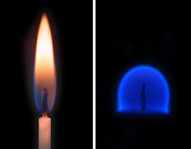 На Земле, благодаря наличию гравитации, возникают конвекционные потоки, которые образуют форму пламени. Они поднимают раскаленные частички сажи, которые излучают видимый свет. Благодаря этому мы видим пламя (рис. 1а). Рис. 1. Пламя свечи: а) в условиях гравитации; б) в условиях невесомости В невесомости конвекционные потоки отсутствуют, частички сажи не поднимаются, а пламя свечи принимает сферическую форму (рис. 1б). Из-за того что материал свечи представляет собой смесь предельных углеводородов, они при сгорании выделяют водород, который горит голубым пламенем. Ученые стараются понять, как и почему огонь распространяется в невесомости. Изучение пламени в условиях невесомости необходимо для оценки пожароустойчивости космического корабля и при разработке специальных средств пожаротушения. Так можно обеспечить безопасность космонавтов и транспортных средств. В другом эксперименте исследователи Ведхе Нейагам (Vedha Nayagam, Исследовательский центр, Кливленд) и Форман Виллиамс (Forman W