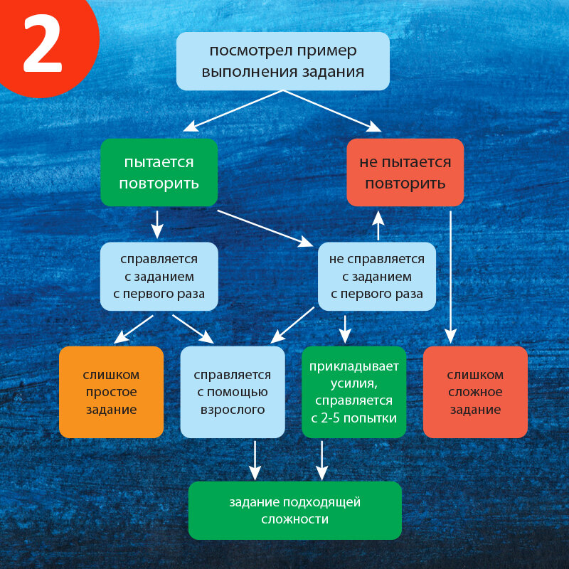 Если ребенок пытается повторить ваши действия и справляется с вашей помощью или справляется только после нескольких попыток – это адекватный уровень сложности.