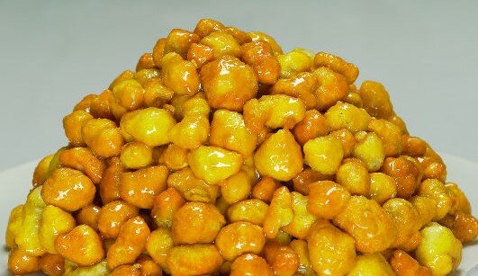 Самое время полакомиться восточной сладость Чак-чак. Нам понадобиться: 1. Яйца 3шт. 2. Желток 2 шт. 3. Сода 1 ч.ложка. 4. Соль 1/2ч. ложки. 5. Мука 350г. 6. Сок лимона 1ч. ложка. 7. Масло растительное 600-800мл. Для сиропа: 1. Мед 150мл. 2. Сахар 100г. Приготовление: 1. Отделить желтки двух яиц. Взбить (желательно миксером) 3 куриных яйца и 2 желтка до крутой пены. 2. В муку 300г. добавить яйца, соду, сок лимона и соду. 3. Вымесить тесто (тесто должно быть гладким и однородным.) 4. Оставить тесто на 15 минут. 5. Тесто разрезать на несколько частей и сделать тонкие жгутики. 6. Нарезать на мелкие шарики, обвалять их в муке. Перед тем как жарить встряхнуть шарики через дуршлаг. (Чтоб стряхнуть лишнюю муку). 7. Разогреть масло и обжарить шарики несколькими порциями 1-2 минуты до золотистого цвета. 8. Растопить мед в небольшом сотейнике. Добавить сахарный песок и все это растопить на среднем огне. В течении еще 3 минут. 9. Вылить медовый сироп 2/3 в готовые шарики. Хорошо перемешать.