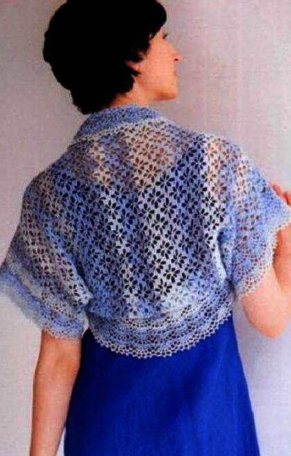 Нет необходимости вязать перед и спинку - изделие вяжется одной деталью. Эта ажурная накидка и правда напоминает морозные узоры на окне! Очень нужна всем снегурочкам... и не только) (Выполненная в теплых тонах, накидка будет актуальна в любом сезоне) Такая накидка "маргарет" - перевертыш, у нее нет низа и горловины) Материалы: Пряжа 220гр, крючок 3/0, 4/0 Образец: Узорная вязка 1 узор – 4,5см, 13 рядов – 10см Размеры готового изделия: Длина 56см, длина рукава 40,5см При работе обратить внимание: Вязать в 1 нитку соответствующим крючком. 1. Основную деталь вязать, набрав цепочку из 174 петель, узорной вязкой без убавлений и прибавлений. 2. С обеих сторон на основной детали в местах подмышек (отмеченных знаками на схеме) сделать швы. 3. Край основной детали и рукава обвязывать вкруговую. Все японские схемы и комментарии переведены на русский язык специально для этой статьи. Надеюсь, она будет для вас полезной! По-японски такая модель одежды называется МАРГАРЕТ. Сколько я не искала