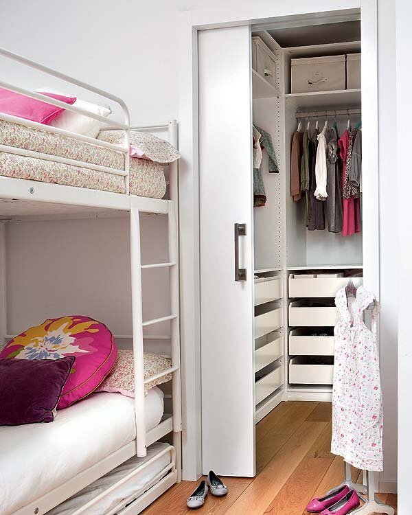 Кладовки в хрущевках маленькие, чуть больше 2 м2. Но даже из них получаются вполне вместительные гардеробные, если правильно их продумать. 1. За счет кладовки можно увеличить площадь спальни и в образовавшуюся нишу вписать шкаф или сделать гардеробную. 2. Чтобы вещи в кладовке не пропитывались неприятными запахами, сделайте косметический ремонт и подумайте как она будет вентилироваться. 3. Освещение должно быть ярким, чтобы можно было увидеть то, что лежит в углах между полок. Выбирайте небольшие светильники, с минимальным накаливанием. Это может быть сочетание точечных светильников и светодиодной подсветки. Очень удобно, когда установлен датчик открытия двери. Свет автоматически включается, когда вы заходите внутрь и выключается, когда вы закрываете дверь. 4.Перед планированием полок, поймите какие вещи вы собираетесь хранить в гардеробной. Присмотрите ящики и коробки, которые вы будете использовать. Исходя из их размера, рассчитайте глубину и ширину полок. 5. Используйте выдвижные