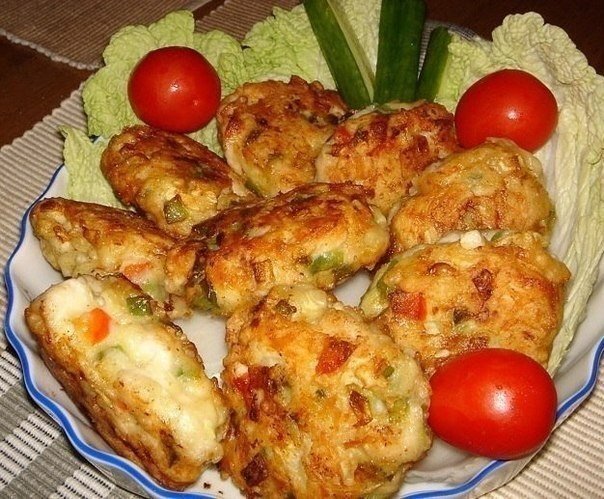 Рецепт очень вкусных и полезных котлет из куриного мяса с овощами и сыром. Вкус у этих котлет получается очень пикантный и необычный. Ингредиенты: - куриное филе - сыр - кабачок - болгарский перец - яйцо - мука - соль, перец - по-вкусу - растительное масло для жарки Приготовление: 1. Все ингредиенты берутся примерно в равных количествах. 2. Куриное филе, болгарский перец и кабачок нарезать на маленькие кусочки, сыр натереть на крупной терке. 3. Замесить фарш из курицы, овощей, сыра, муки и яиц. Посолить и поперчить по-вкусу. 4. Из фарша сформировать котлеты и обжарить на растительном масле с обеих сторон. 5. Готовые котлетки подавать с гарниром и овощами. Приятного аппетита!