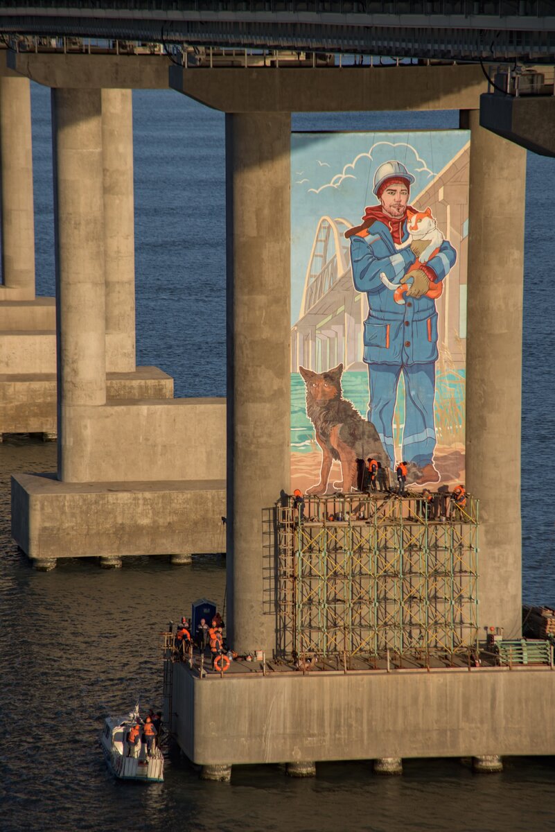 Крымские художники нарисовали большой портрет мостостроителя. Они изобразили рабочего на фоне судоходных арок Крымского моста. Рисунок высотой почти 20 метров выполнен на автодорожной опоре. Его увидят пассажиры поездов, которые будут следовать через Керченский пролив с материка на полуостров, а также экипажи проходящих под мостом судов. Ростовой портрет посвящен команде, строящей Крымский мост – это 15 тысяч инженеров и рабочих со всей страны. В коллективах есть специалисты, которые прошли глобальные стройки: БАМ, подготовку к саммиту АТЭС во Владивостоке, Универсиаде в Казани, Олимпиаде в Сочи. Работа над портретом велась на протяжении двух недель: строители подготовили подмости, а крымские художники нанесли рисунок специальными красками для художественной росписи бетонных поверхностей. Рабочего изобразили с талисманами Крымского моста – котом Мостиком и псом Цыганом. Они провели на стройплощадке четыре года и видели всю работу – с первый свай до финальных рельсов.