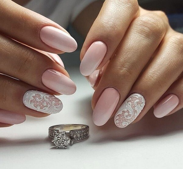 Свадьба самое лучшее что может быть в жизни (как и рождение детей). И на этот прекрасный праздник, мы подготовили несколько красивых свадебных дизайнов ногтей. Непременно не нужно забывать, что свадебные дизайны маникюра должны быть в пастельных, нежных цветах. Мы покажем вам несколько идей для маникюра, а какой вам понравится и вы решите сделать, или сделать что-то подобное вы выбираете сами. И так, начнём. Первый дизайн в нежном розовом и белом цвете. На всех ногтях кроме безимянного есть градиент переходящий из розового в белый цвет. На безимянном пальце есть объемный дизайн. Следующий дизайн для свадебного маникюра это стандартный френч. Он может быть как обычного белого цвета, так и какого нибудь нежного, пастельного цветов. Так же может быть френч с дизайном на одном или нескольких пальцах. Следующий дизайн - это дизайн с блестками. Блестки могут быть как на одном так и на нескольких ногтях. Они могут полностью покрывать ноготь, а могут идти переходом снизу в верх или сверху