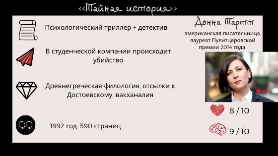 Пока не утихают разговоры об экранизации "Щегла" Донны Тартт, на меня напало желание прочитать "Тайную историю" - первую книгу автора. Что меня привлекло в ней? Это студенческий роман. А всю эту школьно-студенческую обстановку в книгах я люблю. Более того, место действия - филфак. Из интервью Донны Тартт: Мне нравится метод Диккенса. У него даже самый незначительный персонаж становится выпуклым, настоящим и живым. Я тут скоро собираюсь написать пост о своих книжных итогах года. Если я надумаю включать туда номинацию "Самый мрачный финал года", то это место определенно будет отдано "Тайной истории". Нет, это не плохо, я как раз не любитель хеппи-эндов. "Тайная история" - это детектив наоборот. Почти как "Преступление и наказание". Убийца известен с самого начала. Здесь важно не "кто убил", а "как убил и зачем убил". Мотивы убийства. Психологизм. Муки совести. Кстати, вся книга полна отсылками к Достоевскому. Как явными, так и скрытыми. Главный герой понимает, что медицина - это не для