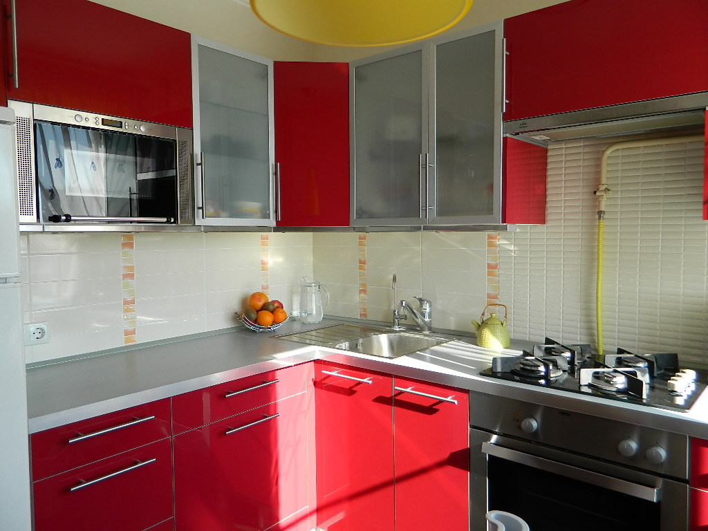 Микроволновка — вещь, несомненно, полезная в хозяйстве. Только вот немаленькая по габаритам. К тому же её нельзя ставить вплотную к стене, что усложняет задачу вписать её в маленькую кухню. Давайте посмотрим, как это можно сделать, а как лучше не нужно. Откровенно неудачный вариант. Во-первых, холодильник высокий, то есть пользоваться микроволновкой придётся в прыжке. Во-вторых, доставать тарелку горячего супа, высоко подняв руки над головой, не просто неудобно, а ещё и опасно. В-третьих, если вы собираетесь делать в микроволновке что-нибудь более внушительное, чем горячие бутерброды, холодильник быстро заляпается. И в-четвёртых, зазор между краем холодильника и краем микроволновки слишком мал, чебурахнется она с высоты во время работы, да и всё. Когда микроволновка работает, она, знаете ли, вибрирует. Здесь ещё «лучше». Прямо вижу, как человек, привстав на цыпочки, достаёт горячую тарелку, осторожно несёт её несколько шагов (ведь ближайшая рабочая поверхность занята), и тут на него