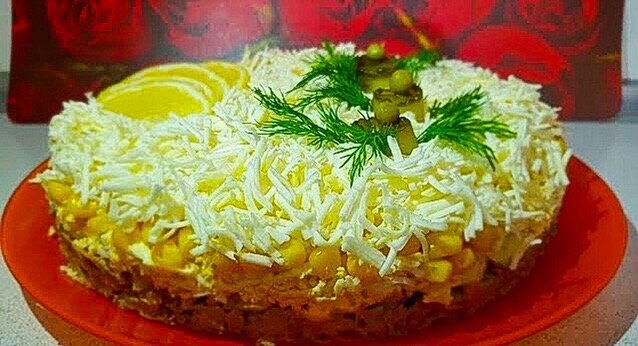 Вкусный и необыкновенный салат на праздничный стол. Ингредиенты: 1. Куриная печень - 500 гр. 2. Консервированная кукуруза - 1 банка. 3. Куриные яйца - 3 шт. 4. Морковь - 1 шт. 5. Плавленые сырки - 2 шт. 6. Репчатый лук - 1 шт. 7. Сахар - 1/2 ч. ложка. 8. Соль - 1 ч. ложка 9. Уксус 9% - 2 ст. ложки. 10. Вода - 4 ст. ложки. 11. Майонез - по вкусу. Способ приготовления: 1. Репчатый лук мелко нарезать и переложить в небольшую глубокую миску. Добавить соль (1 ч. ложку), сахар (1/2 ч. ложки), уксус 9% (2 ст. ложки) и воду (4 ст. ложки). Тщательно перемешать и оставить мариноваться на 15-20 минут. Через указанное время слить жидкость. 2. Морковь натереть на крупной терке. Сковороду хорошенько разогреть с растительным маслом и обжарить морковь до готовности. 3. Куриную печень отварить до готовности, а затем натереть на крупной терке. Соединить печень с обжаренной морковью, добавить майонез и тщательно перемешать. 4. Куриные яйца и плавленые сырки натереть на мелкой терке. СБОРК
