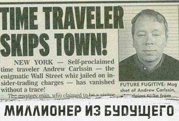 Дежавю "Назад в будущее" или невероятный миллионер. В декабре 2002 года агенты ФБР арестовали в Нью-Йорке 44-летнего мужчину по подозрению в мошенничестве. Мол, играя на бирже, он вступил в преступный сговор с менеджерами компаний, торгующих акциями. Имея 800 долларов, подозреваемый за 2 недели заработал 350 млн! Это и вызвало подозрение у ФБР. Арестованный назвался Эндрю Карлсиным. Он поведал, что работал один, а информацию получал из… будущего. Откуда, собственно, и прибыл к нам из 2256 года. Такова вкратце история «миллионера из будущего». Исследования подтвердили, что нет никакой информации о том, что он существовал до декабря 2002 года. Мнение брокеров с Уолл-стрит: владея инсайдерской информацией, нереально столько заработать. Значит, Карлсин не врет. По итогу, за арестованного кто-то внес залог в миллион долларов. Тот вышел из тюрьмы и, естественно, пропал. И вот что еще странно: на всех сайтах не осталось и следа о Эндрю. Все подробности остались только в копиях. А это рож