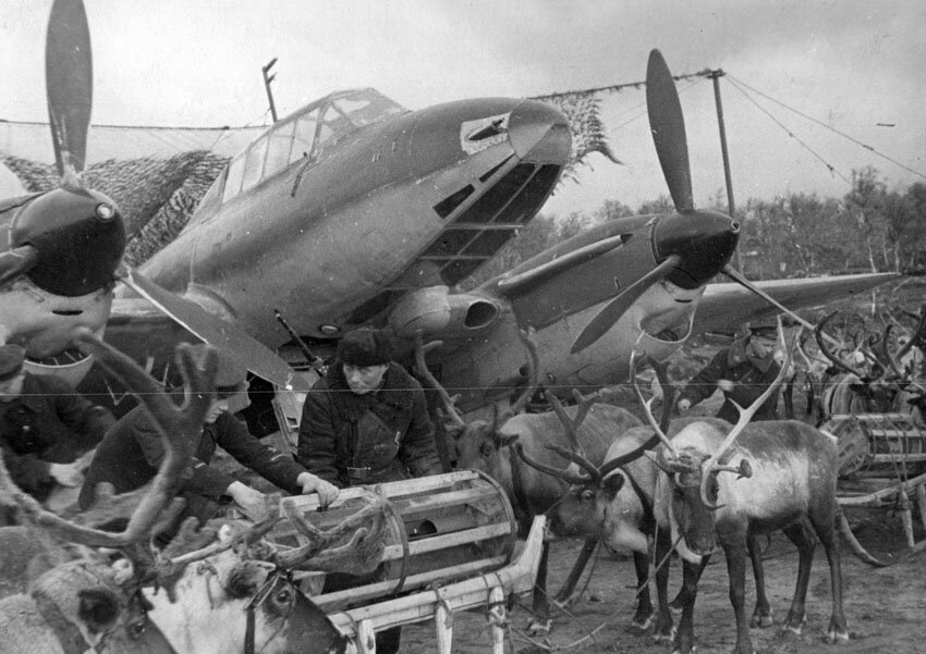 Интересно , что оба кадра сделаны в момент подвески боеприпасов. Пешки - это Северный флот , лица каюров и оленья тяга однозначно об этом говорит. А вот торпедоносные Ил-4 скорее всего с Балтики - именно там в конце войны работали торпедоносцы.