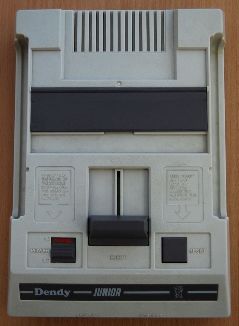 Dendy Junior - игровая приставка, неофициальный аппаратный кллон консоли третьего поколения Famicom (выпускалась примерно с апреля 1993 года) внешне схожа с оригинальной приставкой Famicom. Также имела два геймпада прямоугольной формы, которые, в отличие от оригинальных, можно было отсоединять, подключались они спереди приставки. Световой пистолет в стандартной комплектации отсутствовал, но его можно было купить отдельно и присоединить вместо второго геймпада.