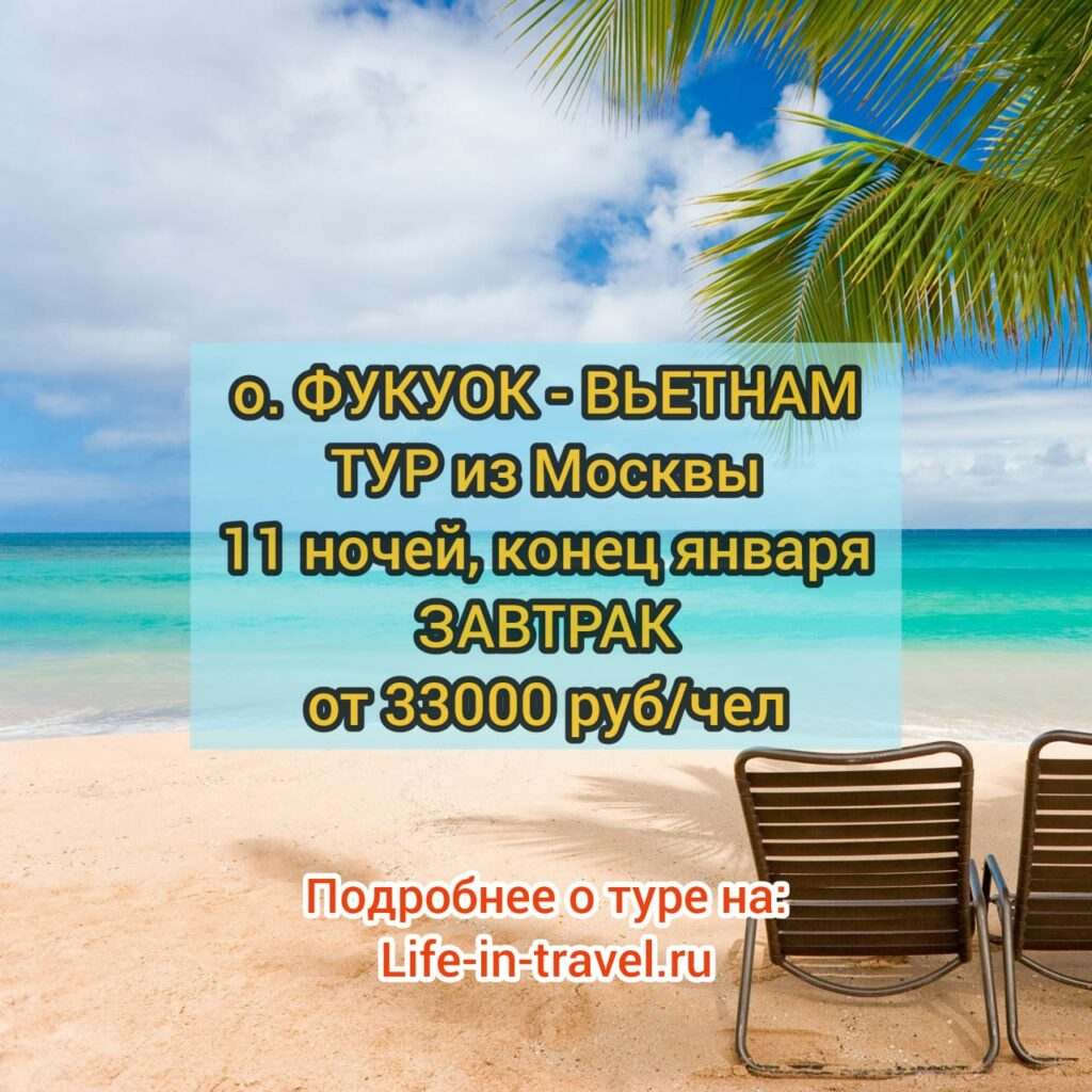 ⏩ Этот тур на Travelata Москва — остров Фукуок (Вьетнам), цена от 33071 рубля на 1 человека, при двухместном размещении, на 11 ночей. Цена приведена с учетом применения промокода Травелата на скидку: AF300Lifeintravel — скидка на тур 300 рублей (при стоимости тура от 20000), AF500Lifeintravel — скидка на тур 500 рублей (при стоимости тура от 40000). Вылет: 28 января 2020 Немного дороже с вылетом 24 января 2020 (пятница) — от 34348 руб/чел ⏩ ПОСМОТРЕТЬ В тур входит: ПОСМОТРЕТЬ ЭТОТ ТУР Пример брони: Вьетнам, остров Фукуок, Amon 3* — 33071 рубль (с учетом применения промокода на скидку AF500Lifeintravel) на 1 человека при двухместном размещении на 11 ночей, ЗАВТРАК (Т