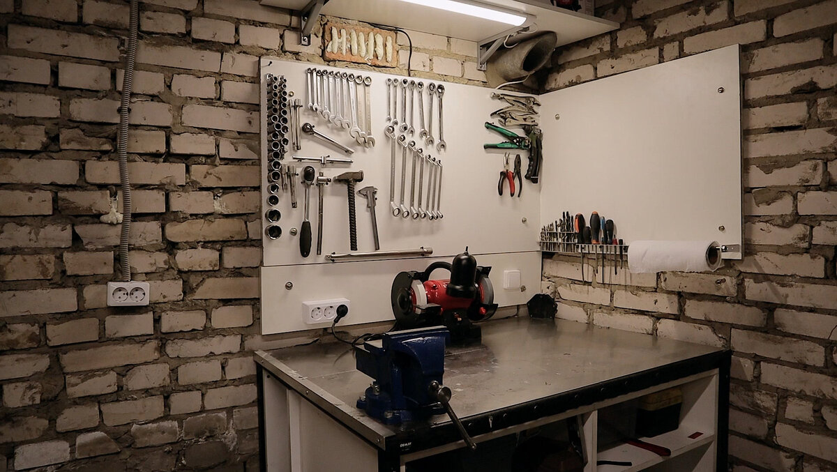 Продолжая прошлые посты. Провёл проводку для розеток и лампы над верстаком. Лампу использовал светодиодную 4000к. По поводу яркости: когда включаешь свет над верстаком, такое ощущение, что выключается свет в гараже. Больше месяца назад купил новые тиски взамен сломаным советским и точило. Наконец то всё распаковал и попробовал. Сразу же попытался заточить все свёрла, которые нашёл и сделал для них простой органайзер из алюминиевых уголков. Понравился мне этот уголок, поэтому решил сделать из него и органайзер для отвёрток. В прошл��м году красил свою машину и была нужда постоянно протирать и обезжиривать. Было не очень круто делать это старыми дырявыми трусами, поэтому нашёл отрывные тряпки, которые очень полюбил, единственная проблема: без вешалки неудобно пользоваться. Нашёл в гараже остаток алюминиевой трубки, пару уголков и шпильку. Лето уже скоро, нужно заниматься покраской своей машины, поэтому в следующий раз буду делать простую вытяжку, завешивать стены и облагораживать пневмо-