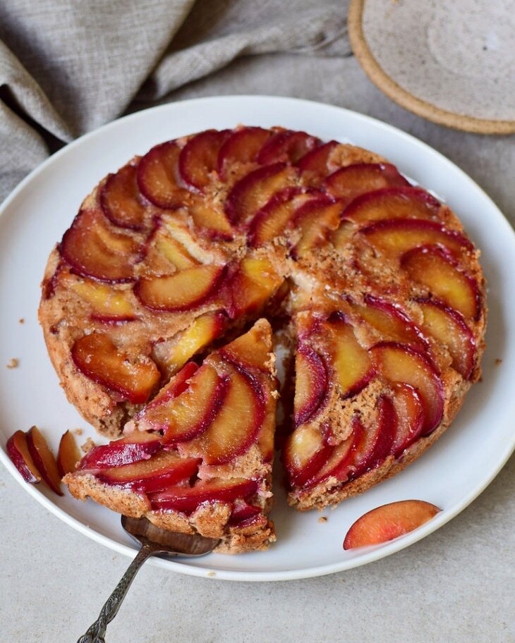 Пирог выпекается в предварительно разогретой до 160-180 градусов духовке: первые 30 минут, накрыв фольгой и еще 30-35 минут без нее. Готовый пирог достаем из духовки. Оставляем на 10-15 минут, а затем просто переворачиваем на тарелку. Нарезаем и подаем к чаю.
