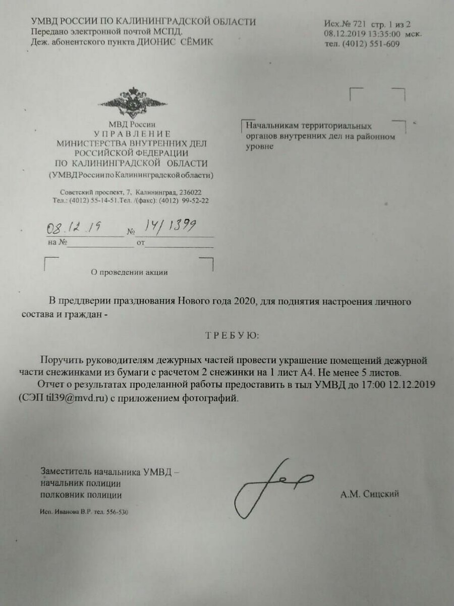 10 ноября в рунете активно обсуждалась новость о приказе местного руководства МВД по Калининграду с текстом: В преддверии празднования Нового года 2020, для поднятия настроения личного состава и граждан - требую: Поручить руководителям дежурных частей провести украшения помещений дежурной части снежинками из бумаги с расчётом 2 снежинки на 1 лист А4. Не менее 5 листов. Отчёт о результатах проделанной работы предоставить в тыл УМВД до 17:00 12.12.2019 с приложение фотографий. Коллеги на моей работе, да и вся страна, активно обменивались данным сообщением весь день. Приказ действительно был похож на настоявший и вызвал бурю эмоций! Оказалось, что это была шутка двух дежурных, которые послали на факс в соседнее управление данное требование. К счастью провинившихся, руководство оказалось на редкость адекватным и тоже пошутило над коллегами, приказав вырезать снежинки в кабинете начальства.