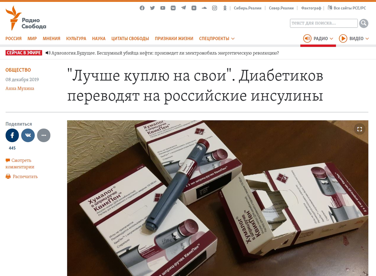 8 декабря на сайте “Радио свобода” вышла статья "Лучше куплю на свои". Диабетиков переводят на российские инсулины”. Там есть и мое интервью. Получился довольно толковый материал, рекомендую его к прочтению. Сложное объяснено доступным и простым языком. Освещены разные позиции “за” и “против” отечественных инсулинов (Источник 1). Однако есть у материала и ряд недостатков, главный из которых - излишнее педалирование негатива в отношение российских инсулинов и их производителей. Почему люди против отечественных препаратов Среди диабетиков страны в настоящий момент наблюдается паника по поводу российских инсулинов, которые стали выписывать и выдавать вместо привычных всем импортных, главным образом в регионах РФ. Опасения людей вполне объяснимы: Но при этом я не понимаю, зачем огульно называть российские препараты плохими? Ни одного реального аргумента от распространяющих подобные сведения мне увидеть не удалось. По их мнению, российское плохое по умолчанию, так как Россия не может дел