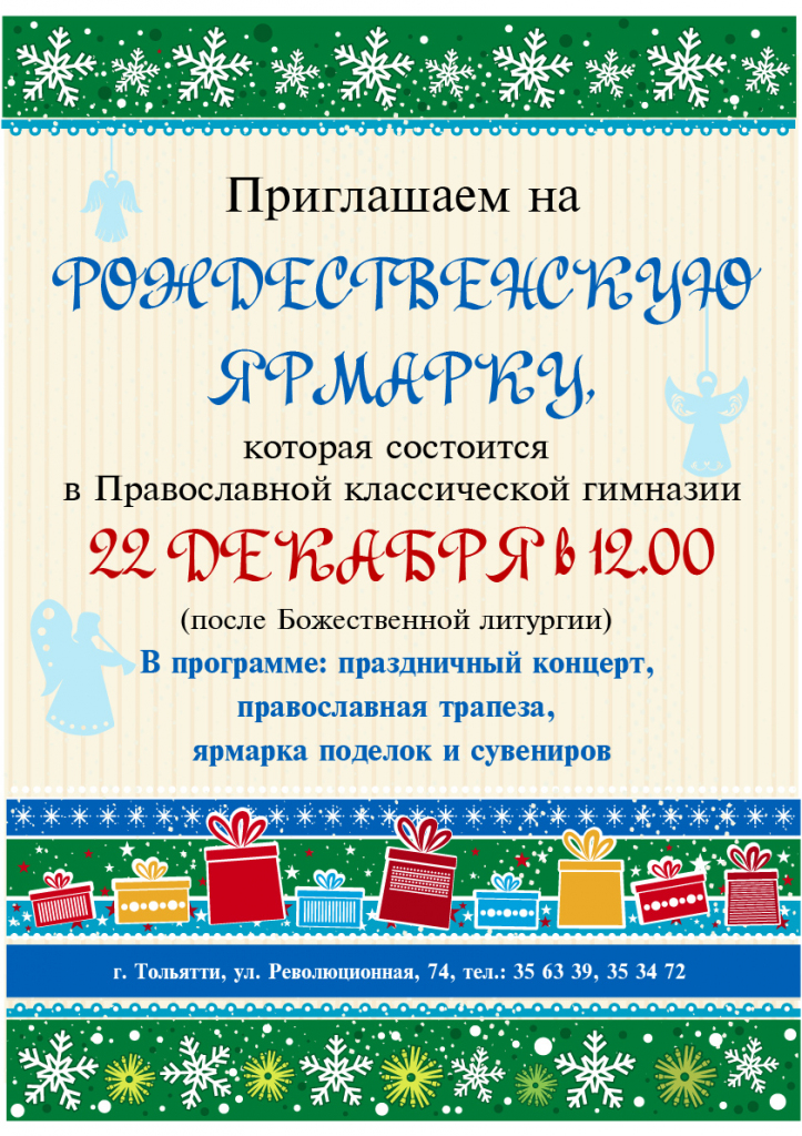 Дорогие учащие, учащиеся, родители, бабушки и дедушки, а также все желающие! Приглашаем вас на Рождественскую ярмарку, которая состоится в Православной классической гимназии (ул.Революционная, 74) 22 декабря в 12:00 (по окончании литургии) в трапезной гимназии.