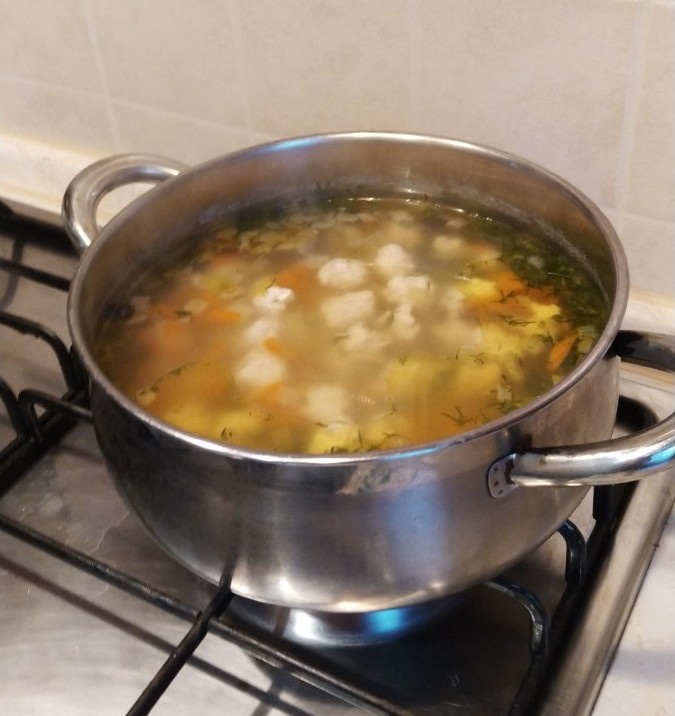 Компоненты на 3л. супа: 300 гр. филе индейки (можно курицы/ свинины) 5 средних картофелин 1 средняя луковица 1 небольшая морковка перец душистый – 3 шт. перец черный горошком – 5шт, лавровый лист – 1 шт подсолнечное масло для зажарки укроп+петрушка по несколько веточек соль, перец молотый по вкусу 1. Ставим греться воду. Мясо перемалываем на мясорубке в фарш. Готовый фарш солим и перчим, так фрикадельки получатся вкуснее. Смачиваем руки в воде, чтобы фарш не прилипал и катаем фрикадельки. Когда вода закипит, закидываем в нее фрикадельки. Добавляем лавровый лист, душистый и черный перец. 2. Чистим и нарезаем сантиметровыми кубиками картошку. Бросаем к варящимся фрикаделькам. Солим по вкусу. 3. Чистим лук и морковку. Лук нарезаем мелким кубиком, морковку тоненькими брусочками. Нагреваем сковородку с подсолнечным маслом, обжариваем лук до прозрачности, затем добавляем на сковороду морковку и протушиваем еще 5 минут. Отправляем лук с морковкой в кастрюлю. 4. Даем повариться еще мину