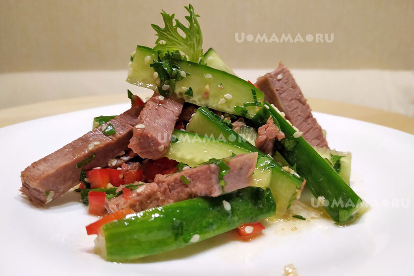 Хотите приготовить вкусный салат, не перегруженный майонезом или жирными сортами мяса? Выбирайте в качестве основного ингредиента отварную говядину, сочетайте её с огурцами и свежими салатными листьями, а соевый соус и кунжутное масло придадут ему легкую восточную нотку. Также мы посчитали количество калорий в порции! Понадобится: Огурцы – 300 гр. Говядина (мякоть, без костей) - 500 гр., или вареная – 300 гр. Для варки мяса: морковь, луковица, стебель сельдерея, лавровый лист – по 1 шт. Перец болгарский – ½ шт. Чеснок – 1 зубок Петрушка – ½ пучка Кунжут – 2 чайные ложки (по желанию) Листовой салат – 1 пучок Заправка: Соевый соус – 1 ст.л. Соль – щепотка Масло кунжутное – 40 мл. Уксус или лимонный сок – 1 ст. л. Итого: 820 г. 4-6 порций Белки 84.4, жиры 92.9, углеводы 17.5, ккал 1241.0 На 100 гр.: белки 10.2, жиры 11.3, углеводы 2.1, ккал 150,4 Приготовление * Сварите говядину в небольшом количестве воды – так, чтобы вода только покрывала мясо. Добавьте соль, лавровый лист, морковк