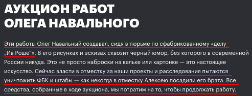 С 13 по 27 ноября 2019 г. брат Олег Навальный – брат главы ФБК Алексея Навального, проводил аукцион своих работ по тюремной тематике на электронной площадке магазина Shop.Navalny. Участникам торгов предлагалось сделать ставки и приобрести 20 рисунков и эскизов, созданных О. Навальным во время отбывания им тюремного срока в исправительной колонии №5 в Орловской области по статьям «Мошенничество в сфере предпринимательской деятельности» и «Отмывание денежных средств или иного имущества, приобретенных лицом в результате совершения им преступления». Организаторами было заявлено, то все собранные в ходе аукциона средства будут направлены на работу ФБК. За все выставленные на аукцион работы Олега Навального было выручено около 362 тыс. руб. «Художественная ценность» этих работ вызывает большое количество вопросов. Отметим, что в сентябре 2019 года Навальные уже пытались проводить сбор средств для ФБК посредством популяризации АУЕ-культуры. На музейной выставке его работ посетителям предла