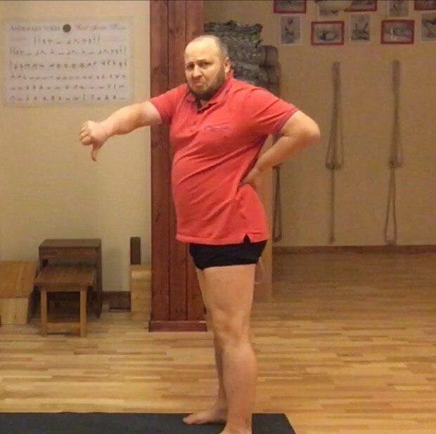 Удлиняем поясницу в наклоне вперед. Начинаем из положения стоя. Это особенно подойдет людям в теле. А потом уже сидя, лежа, на голове, плечах и как хотите.