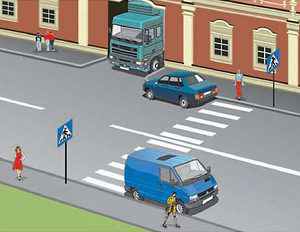 На рисунке изображен участок дороги, где припаркованы три автомобиля. Водители легкового автомобиля и минивэнена оставили свои машины сразу за пешеходным перекрестком, водитель грузовика припарковался на выезде из двора. Вопрос. Кто из водителей нарушил правила парковки? [Ответ в конце статьи] Теория п 12.4 ПДД. Остановка запрещается: на трамвайных путях, а также в непосредственной близости от них, если это создаст помехи движению трамваев; на железнодорожных переездах, в тоннелях, а также на эстакадах, мостах, путепроводах (если для движения в данном направлении имеется менее трех полос) и под ними; в местах, где расстояние между сплошной линией разметки (кроме обозначающей край проезжей части), разделительной полосой или противоположным краем проезжей части и остановившимся транспортным средством менее 3 м; на пешеходных переходах и ближе 5 м перед ними; на проезжей части вблизи опасных поворотов и выпуклых переломов продольного профиля дороги при видимости дороги менее 100 м