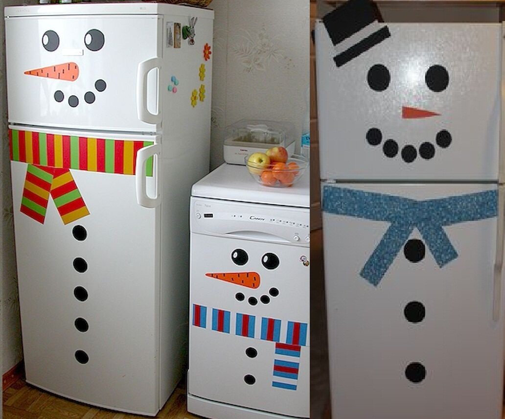 Смотрится свежо и весело - самый быстрый способ: взять цветную бумагу самоклеющуюся и вырезать необходимое и придать бытовой технике праздничное настроение. Все делается быстро, старший обожает что-то клеить и вырезать. Наверное остановимся на снеговике, уж очень подходящий образ.