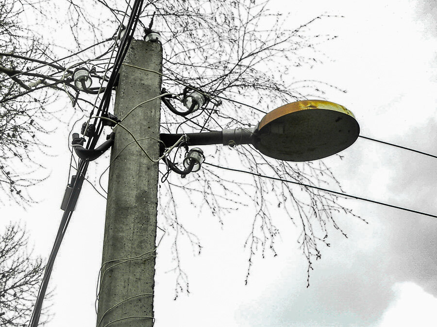 Последняя опора, конец линии, падение напряжения... неужели на линии освещения завышенное напряжение, и лампы на это реагируют... так, какие ещё отличия этого светильника от остальных... лампа стоит не на опоре, а на её подкосе. Поэтому она стоит... более вертикально!!!