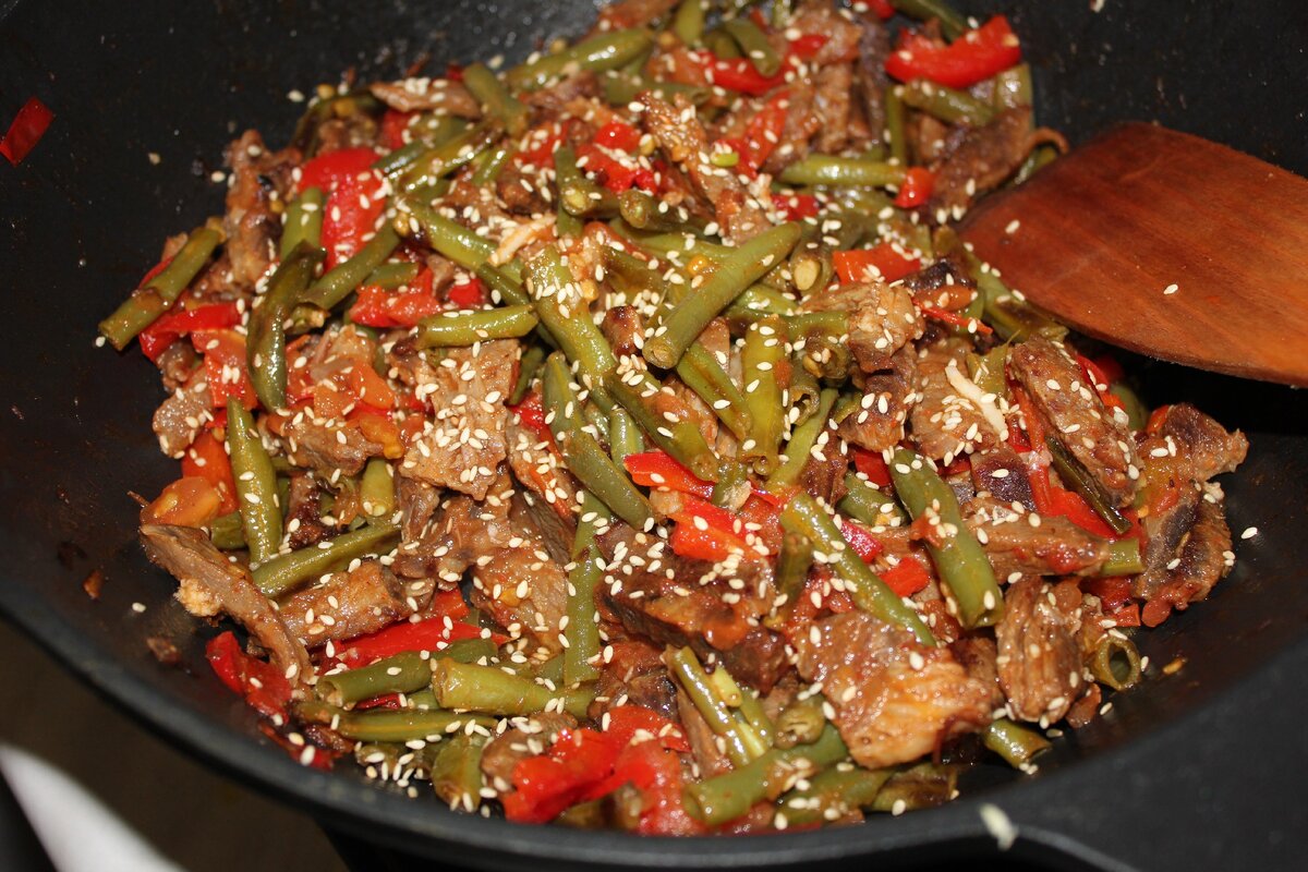 Сытный и вкусный салат один из любимых ужинов в нашей семье. Предлагаю и вам попробовать его приготовить. Рецепт простой и всепродукты можно найти в ближайшем супермаркете. Нам понадобится: Приготовим заранее: 3.Режем помидор кубиками Приготовление блюда: - В разогретую сковороду добавляем масло - Опускаем ломтики мяса в сковородку и обжаваем минут 5 Далее добавляем к мясу стручковую фасоль. Тщательно мешаем. Аккуратно солим.Тушим примерно минут 10. Дальше добавим в сковородку болгарский перец. И все снова перемещаем. Тушим около 5 минут Предпоследним добавляем помидор и чеснок. Хорошо промешиваем и не убираем с огня ещё минуты 3. Разогреваем небольшую сковородку и без масла обжариваем кунжут. На это уйдет примерно 1 минута. Как только он станет желтеть нужно снять с огня. Добавляем кунжут уже к приготовленному горячему салату !!!Всем приятного аппетита!!!
