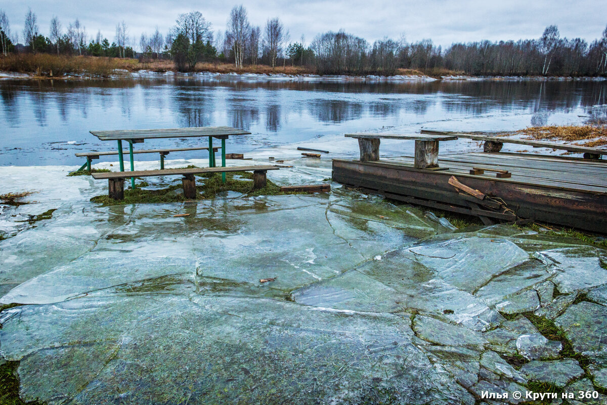 Первая сферическая панорама с обзором на 360°, то что я считаю плохим качеством, быстрые панорамы в один клик. Вода ушла, лёд остался и потрескался, из-за тепла истончается.