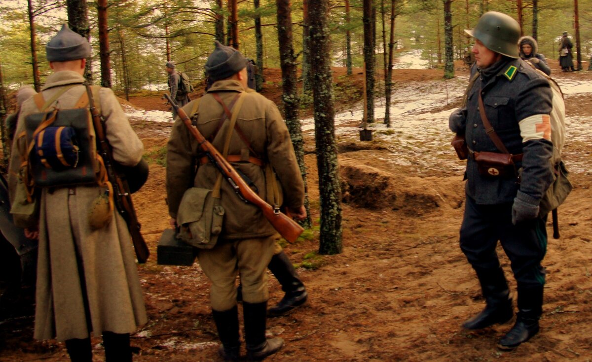 В воскресенье посетил реконструкцию, посвященную началу советско-финской зимней войны. Мероприятие проходило в деревне Морьё в прибрежных дюнах Ладожского озера Советские солдаты и финский санитар Почти аутентичная картинка... А вот господин непонятно за кого будет воевать... Быт финской армии... Советский пограничный столб. Советское подразделение на фоне озера Одинокий финский солдат Таваай поккурим сто ли? Есть чем остановить "рюсся" Разговор на границе Офицер недоволен.... Товарищ Сталин отдал нам приказ... Сатан перкеле! Рюсся идут... 30 ноября 1939 г. в 6.00 утра части Красной Армии перешли советско-финскую границу. Мы идем как освободители трудового народа и финского пролетариата. Даешь Хельсинки за две недели! Но финский пролетариат ведет по нам огонь... Огонь по белофиннам! Урааа!!! Атака отбита... Взять линию Маннергейма ко дню рождения товарища Сталина! Но финны не сдаются... Снова огонь артиллерии, но враг не сдается... Ценой б