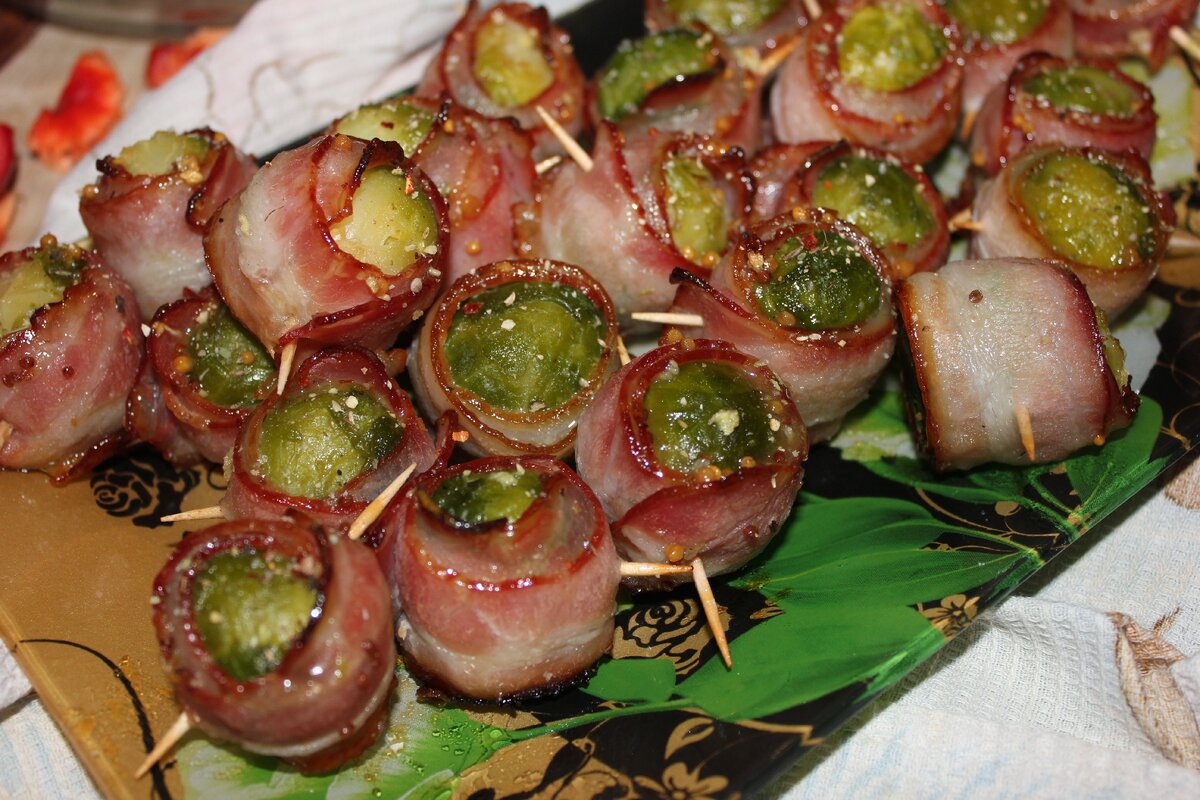 Оригинальная и вкусная закуска родом из Америки. Можно готовить хоть каждый день. А так же блюдо станет украшением любого праздника. Попробуйте -не пожалеете. Ингредиенты: 1. Брюссельская капуста 450 г. 2. Бекон около 20 ломтиков 0/ Для соуса 1.Мед 2 ст.ложки 2.Горчица с зёрнами 3. Два зубчика чеснока Соль и специи по вкусу Способ приготовления: 1. Заранее разогреваем духовку до 180-200 градусов. 2. Обязательно замолчите зубочистки минут на 10-15 в воде. Чтоб в духовке они не подгорели 3. В кипящую подсоленную воду бросаем брюссельскую капусту и варим ее минуты 3 после закипания воды 4. Ломтиками бекона обворачиваем каждую капусту. Зубочисками закрепляем. ( Как на фото) 5. Выкладываем каждую на противень застеленый фольгой. Расстояние примерно 2 см между капустами. Ставим в духовку на 10 минут. Делам соус: Смешаем мед,горчицу,соль,специи и чеснок в отдельной посуде. 6. Через 10 минут достаем капусту в беконе и смазываем соусом каждую штуку. И снова запекаем 10 минут. 7. Ароматн