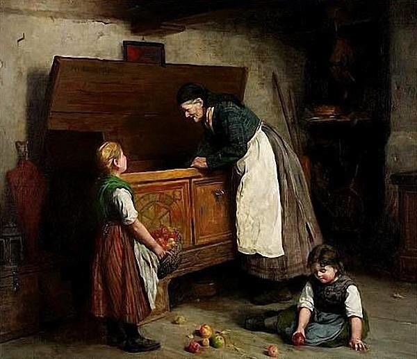 И вот вечер - все дела переделаны, ужин состоялся, посуда перемыта и высушена. бабушка наконец вытирает руки о фартук и садится на стул. В комнате тепло, в печке весело горит и потрескивает огонь. Я осторожно подхожу, сажусь на пол и кладу голову бабушке на колени, бабушка гладит меня по голове своей натруженной и немного шершавой рукой. Осторожно говорю: