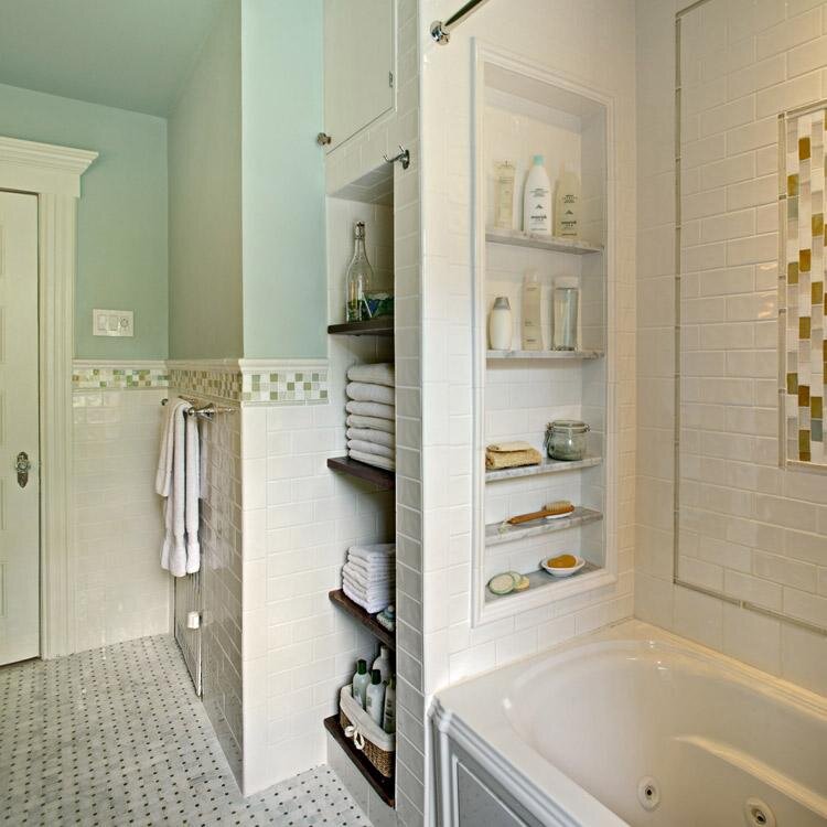 В ванной комнате всегда полно мелочи, которую надо там размещать. Интереса ради, я изучила собственный ассортимент: шампунь, бальзам, пара пачек мыла, крем, лосьон, зубные щётки в стаканчике и паста, пена для бритья и бритва супруга, россыпью шпильки и заколки дочки… И всё это регулярно падает в раковину, потому что полки не хватает. Так что первый вывод – полок в ванной должно быть много! Но главное не переборщить с полочками. И сначала надо тщательно продумать, какие и сколько надо. Расписать на бумаге, какие предметы должны стоять на них, и, уже исходя из этого, рассчитывать количество полок и их местонахождение. Но как их разместить, чтобы не выглядело нелепо, некрасиво и нагромождением? Оптимальный вариант — лесенкой. Так, чтобы одна полочка чуть-чуть накрывала крывала другую. В ванной всегда найдется под это свободная стенка. И на эти полки уже сложить то, что не нужно постоянно под рукой, типа тех же запасов мыла, пены для бритья и шампуней, а также для кремов, которые не нужны